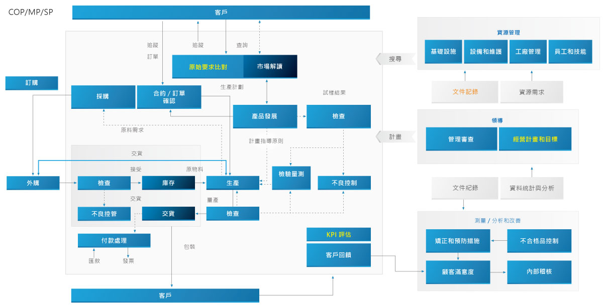 - 為了滿足每一個COP互動的一致性,每一個部門都需要不斷的回溯檢視其是否符合KPI指標的要求,每年年終部門稽核,作為翌年指標設定的依據,由品保部門提出年度報告